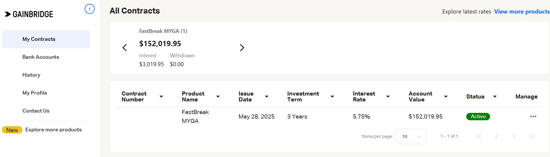 As you can see in the screenshot above, we opened a FastBreak™ annuity with an initial deposit in May of 2025. At the time, we were able to lock in a fixed rate of 5.75% for three years.